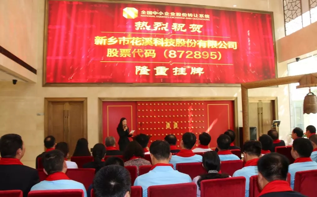 2018年8月31日上午9:30時(shí),新鄉(xiāng)市花溪科技股份有限公司(簡(jiǎn)稱:花溪科技,股票代碼:872895)新三板掛牌敲鐘儀式在北京全國中小企業(yè)股份轉(zhuǎn)讓系統(tǒng)成功舉行。中國農(nóng)機(jī)工業(yè)協(xié)會(huì)副秘書長(zhǎng)寧學(xué)貴、獲嘉縣人民政府縣長(zhǎng)劉軍偉、新鄉(xiāng)市金融局副局長(zhǎng)張延明等特邀嘉賓及公司股東代表、員工代表、主辦券商、律師事務(wù)所、會(huì)計(jì)師事務(wù)所代表共同出席了掛牌儀式,共同見證花溪科技這一里程碑式的重要時(shí)刻。